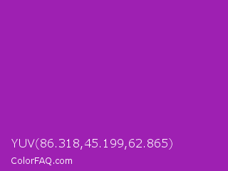 YUV 86.318,45.199,62.865 Color is a normal magenta color and the nearest color is Violet Eggplant #991199. Hex code #9e20b2 and RGB value is rgb(158,32,178). In RGB color space, this color is composed of 62% red, 13% green, 70% blue, In CMYK color space, this color is composed of 11% cyan, 82% magenta, 0% yellow , 30% black , In HSL color space, this color has a hue angle of 292° , 70% saturation and 41% lightness.
