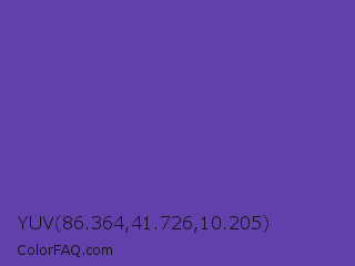 YUV 86.364,41.726,10.205 Color is a normal indigo color and the nearest color is Plump Purple #5946b2. Hex code #6240ab and RGB value is rgb(98,64,171). In RGB color space, this color is composed of 38% red, 25% green, 67% blue, In CMYK color space, this color is composed of 43% cyan, 63% magenta, 0% yellow , 33% black , In HSL color space, this color has a hue angle of 259° , 46% saturation and 46% lightness.