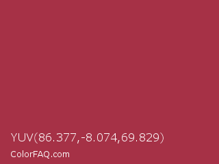 YUV 86.377,-8.074,69.829 Color is a normal red color and the nearest color is Amaranth Purple #ab274f. Hex code #a63146 and RGB value is rgb(166,49,70). In RGB color space, this color is composed of 65% red, 19% green, 27% blue, In CMYK color space, this color is composed of 0% cyan, 70% magenta, 58% yellow , 35% black , In HSL color space, this color has a hue angle of 349° , 54% saturation and 42% lightness.