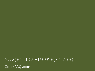 YUV 86.402,-19.918,-4.738 Color is a dark lime color and the nearest color is Dark Olive Green #556b2f. Hex code #51612e and RGB value is rgb(81,97,46). In RGB color space, this color is composed of 32% red, 38% green, 18% blue, In CMYK color space, this color is composed of 16% cyan, 0% magenta, 53% yellow , 62% black , In HSL color space, this color has a hue angle of 79° , 36% saturation and 28% lightness.