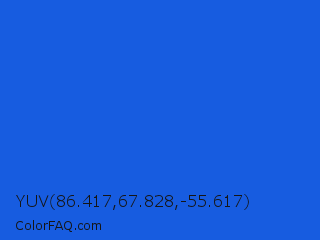 YUV 86.417,67.828,-55.617 Color is a normal blue color and the nearest color is Bright Navy Blue #1974d2. Hex code #175ce0 and RGB value is rgb(23,92,224). In RGB color space, this color is composed of 9% red, 36% green, 88% blue, In CMYK color space, this color is composed of 90% cyan, 59% magenta, 0% yellow , 12% black , In HSL color space, this color has a hue angle of 219° , 81% saturation and 48% lightness.