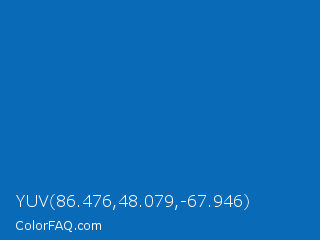 YUV 86.476,48.079,-67.946 Color is a normal blue color and the nearest color is Spanish Blue #0070b8. Hex code #096bb8 and RGB value is rgb(9,107,184). In RGB color space, this color is composed of 4% red, 42% green, 72% blue, In CMYK color space, this color is composed of 95% cyan, 42% magenta, 0% yellow , 28% black , In HSL color space, this color has a hue angle of 206° , 91% saturation and 38% lightness.
