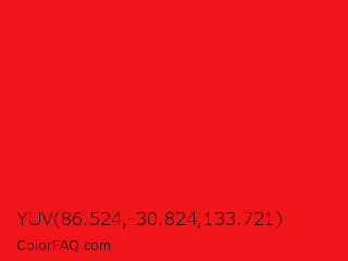 YUV 86.524,-30.824,133.721 Color is a normal red color and the nearest color is Vivid Red #f70d1a. Hex code #ef1518 and RGB value is rgb(239,21,24). In RGB color space, this color is composed of 94% red, 8% green, 9% blue, In CMYK color space, this color is composed of 0% cyan, 91% magenta, 90% yellow , 6% black , In HSL color space, this color has a hue angle of 359° , 87% saturation and 51% lightness.