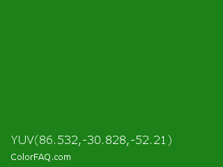 YUV 86.532,-30.828,-52.21 Color is a dark green color and the nearest color is Forest Green #228b22. Hex code #1b8118 and RGB value is rgb(27,129,24). In RGB color space, this color is composed of 11% red, 51% green, 9% blue, In CMYK color space, this color is composed of 79% cyan, 0% magenta, 81% yellow , 49% black , In HSL color space, this color has a hue angle of 118° , 69% saturation and 30% lightness.