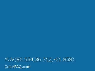 YUV 86.534,36.712,-61.858 Color is a normal blue color and the nearest color is Matisse #1b659d. Hex code #106ca1 and RGB value is rgb(16,108,161). In RGB color space, this color is composed of 6% red, 42% green, 63% blue, In CMYK color space, this color is composed of 90% cyan, 33% magenta, 0% yellow , 37% black , In HSL color space, this color has a hue angle of 202° , 82% saturation and 35% lightness.