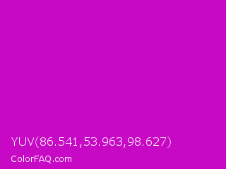 YUV 86.541,53.963,98.627 Color is a normal magenta color and the nearest color is Deep Magenta #cc00cc. Hex code #c708c4 and RGB value is rgb(199,8,196). In RGB color space, this color is composed of 78% red, 3% green, 77% blue, In CMYK color space, this color is composed of 0% cyan, 96% magenta, 2% yellow , 22% black , In HSL color space, this color has a hue angle of 301° , 92% saturation and 41% lightness.
