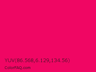 YUV 86.568,6.129,134.56 Color is a normal rose color and the nearest color is Raspberry #e30b5d. Hex code #f00663 and RGB value is rgb(240,6,99). In RGB color space, this color is composed of 94% red, 2% green, 39% blue, In CMYK color space, this color is composed of 0% cyan, 98% magenta, 59% yellow , 6% black , In HSL color space, this color has a hue angle of 336° , 95% saturation and 48% lightness.