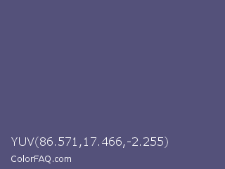 YUV 86.571,17.466,-2.255 Color is a normal indigo color and the nearest color is Purple Navy #4e5180. Hex code #54517a and RGB value is rgb(84,81,122). In RGB color space, this color is composed of 33% red, 32% green, 48% blue, In CMYK color space, this color is composed of 31% cyan, 34% magenta, 0% yellow , 52% black , In HSL color space, this color has a hue angle of 244° , 20% saturation and 40% lightness.