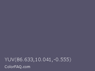 YUV 86.633,10.041,-0.555 Color is a normal indigo color and the nearest color is Scarpa Flow #585562. Hex code #56536b and RGB value is rgb(86,83,107). In RGB color space, this color is composed of 34% red, 33% green, 42% blue, In CMYK color space, this color is composed of 20% cyan, 22% magenta, 0% yellow , 58% black , In HSL color space, this color has a hue angle of 248° , 13% saturation and 37% lightness.
