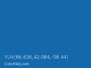 YUV 86.636,42.084,-58.44 Color is a normal blue color and the nearest color is Green Blue #1164b4. Hex code #1468ac and RGB value is rgb(20,104,172). In RGB color space, this color is composed of 8% red, 41% green, 67% blue, In CMYK color space, this color is composed of 88% cyan, 40% magenta, 0% yellow , 33% black , In HSL color space, this color has a hue angle of 207° , 79% saturation and 38% lightness.