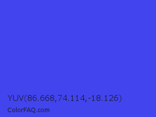 YUV 86.668,74.114,-18.126 Color is a normal blue color and the nearest color is Palatinate Blue #273be2. Hex code #4244ed and RGB value is rgb(66,68,237). In RGB color space, this color is composed of 26% red, 27% green, 93% blue, In CMYK color space, this color is composed of 72% cyan, 71% magenta, 0% yellow , 7% black , In HSL color space, this color has a hue angle of 239° , 83% saturation and 59% lightness.