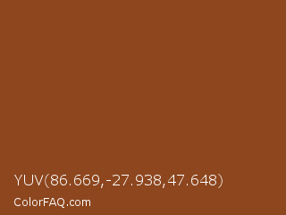YUV 86.669,-27.938,47.648 Color is a normal orange color and the nearest color is Cumin #924321. Hex code #8d461e and RGB value is rgb(141,70,30). In RGB color space, this color is composed of 55% red, 27% green, 12% blue, In CMYK color space, this color is composed of 0% cyan, 50% magenta, 79% yellow , 45% black , In HSL color space, this color has a hue angle of 22° , 65% saturation and 34% lightness.