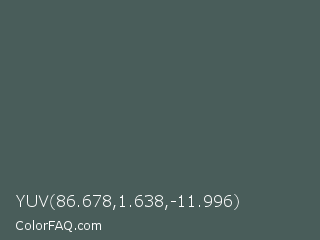 YUV 86.678,1.638,-11.996 Color is a normal cyan color and the nearest color is Feldgrau #4d5d53. Hex code #495d5a and RGB value is rgb(73,93,90). In RGB color space, this color is composed of 29% red, 36% green, 35% blue, In CMYK color space, this color is composed of 22% cyan, 0% magenta, 3% yellow , 64% black , In HSL color space, this color has a hue angle of 171° , 12% saturation and 33% lightness.