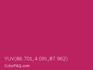 YUV 86.701,4.091,87.962 Color is a normal rose color and the nearest color is Rose Red #c21e56. Hex code #bb225f and RGB value is rgb(187,34,95). In RGB color space, this color is composed of 73% red, 13% green, 37% blue, In CMYK color space, this color is composed of 0% cyan, 82% magenta, 49% yellow , 27% black , In HSL color space, this color has a hue angle of 336° , 69% saturation and 43% lightness.