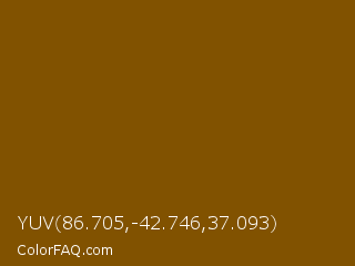 YUV 86.705,-42.746,37.093 Color is a dark orange color and the nearest color is Rusty Nail #86560a. Hex code #815200 and RGB value is rgb(129,82,-0). In RGB color space, this color is composed of 51% red, 32% green, 0% blue, In CMYK color space, this color is composed of 0% cyan, 36% magenta, 100% yellow , 49% black , In HSL color space, this color has a hue angle of 38° , 100% saturation and 25% lightness.