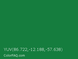YUV 86.722,-12.188,-57.638 Color is a dark green color and the nearest color is Dark Spring Green #177245. Hex code #157d3e and RGB value is rgb(21,125,62). In RGB color space, this color is composed of 8% red, 49% green, 24% blue, In CMYK color space, this color is composed of 83% cyan, 0% magenta, 50% yellow , 51% black , In HSL color space, this color has a hue angle of 144° , 71% saturation and 29% lightness.