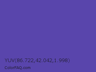 YUV 86.722,42.042,1.998 Color is a normal indigo color and the nearest color is Plump Purple #5946b2. Hex code #5945ac and RGB value is rgb(89,69,172). In RGB color space, this color is composed of 35% red, 27% green, 67% blue, In CMYK color space, this color is composed of 48% cyan, 60% magenta, 0% yellow , 33% black , In HSL color space, this color has a hue angle of 252° , 43% saturation and 47% lightness.