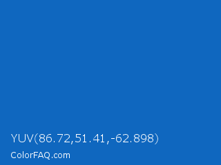 YUV 86.72,51.41,-62.898 Color is a normal blue color and the nearest color is Denim #1560bd. Hex code #0f67bf and RGB value is rgb(15,103,191). In RGB color space, this color is composed of 6% red, 40% green, 75% blue, In CMYK color space, this color is composed of 92% cyan, 46% magenta, 0% yellow , 25% black , In HSL color space, this color has a hue angle of 210° , 85% saturation and 40% lightness.