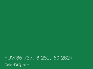 YUV 86.737,-8.251,-60.282 Color is a dark green color and the nearest color is Salem #097f4b. Hex code #127d46 and RGB value is rgb(18,125,70). In RGB color space, this color is composed of 7% red, 49% green, 27% blue, In CMYK color space, this color is composed of 86% cyan, 0% magenta, 44% yellow , 51% black , In HSL color space, this color has a hue angle of 149° , 75% saturation and 28% lightness.