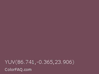 YUV 86.741,-0.365,23.906 Color is a normal rose color and the nearest color is Ferra #704f50. Hex code #724956 and RGB value is rgb(114,73,86). In RGB color space, this color is composed of 45% red, 29% green, 34% blue, In CMYK color space, this color is composed of 0% cyan, 36% magenta, 25% yellow , 55% black , In HSL color space, this color has a hue angle of 341° , 22% saturation and 37% lightness.