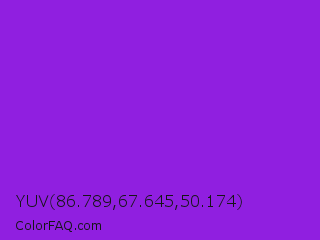 YUV 86.789,67.645,50.174 Color is a normal purple color and the nearest color is Blue Violet #8a2be2. Hex code #901fe0 and RGB value is rgb(144,31,224). In RGB color space, this color is composed of 56% red, 12% green, 88% blue, In CMYK color space, this color is composed of 36% cyan, 86% magenta, 0% yellow , 12% black , In HSL color space, this color has a hue angle of 275° , 76% saturation and 50% lightness.