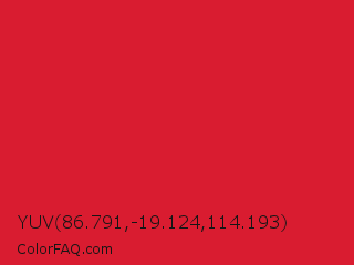 YUV 86.791,-19.124,114.193 Color is a normal red color and the nearest color is Amaranth Red #d3212d. Hex code #d91c30 and RGB value is rgb(217,28,48). In RGB color space, this color is composed of 85% red, 11% green, 19% blue, In CMYK color space, this color is composed of 0% cyan, 87% magenta, 78% yellow , 15% black , In HSL color space, this color has a hue angle of 354° , 77% saturation and 48% lightness.