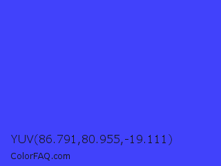 YUV 86.791,80.955,-19.111 Color is a light blue color and the nearest color is Ultramarine Blue #4166f5. Hex code #4142fb and RGB value is rgb(65,66,251). In RGB color space, this color is composed of 25% red, 26% green, 98% blue, In CMYK color space, this color is composed of 74% cyan, 74% magenta, 0% yellow , 2% black , In HSL color space, this color has a hue angle of 240° , 96% saturation and 62% lightness.