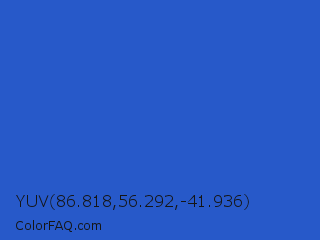 YUV 86.818,56.292,-41.936 Color is a normal blue color and the nearest color is New Car #214fc6. Hex code #2759c9 and RGB value is rgb(39,89,201). In RGB color space, this color is composed of 15% red, 35% green, 79% blue, In CMYK color space, this color is composed of 81% cyan, 56% magenta, 0% yellow , 21% black , In HSL color space, this color has a hue angle of 221° , 68% saturation and 47% lightness.
