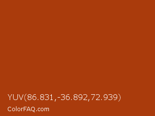 YUV 86.831,-36.892,72.939 Color is a normal orange color and the nearest color is Fire #aa4203. Hex code #aa3b0c and RGB value is rgb(170,59,12). In RGB color space, this color is composed of 67% red, 23% green, 5% blue, In CMYK color space, this color is composed of 0% cyan, 65% magenta, 93% yellow , 33% black , In HSL color space, this color has a hue angle of 18° , 87% saturation and 36% lightness.