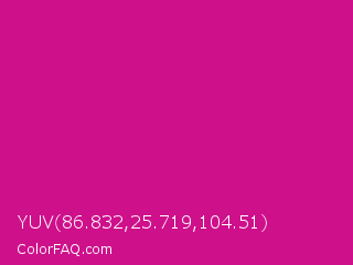 YUV 86.832,25.719,104.51 Color is a normal magenta color and the nearest color is Red Violet #c71585. Hex code #ce108b and RGB value is rgb(206,16,139). In RGB color space, this color is composed of 81% red, 6% green, 55% blue, In CMYK color space, this color is composed of 0% cyan, 92% magenta, 33% yellow , 19% black , In HSL color space, this color has a hue angle of 321° , 86% saturation and 44% lightness.
