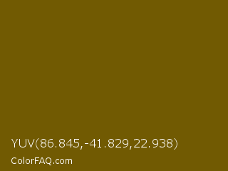 YUV 86.845,-41.829,22.938 Color is a dark yellow color and the nearest color is Spicy Mustard #74640d. Hex code #715a02 and RGB value is rgb(113,90,2). In RGB color space, this color is composed of 44% red, 35% green, 1% blue, In CMYK color space, this color is composed of 0% cyan, 20% magenta, 98% yellow , 56% black , In HSL color space, this color has a hue angle of 48° , 97% saturation and 23% lightness.