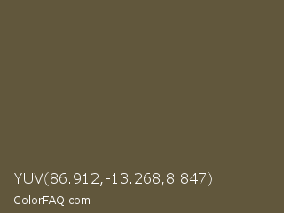 YUV 86.912,-13.268,8.847 Color is a normal orange color and the nearest color is Hemlock #5e5d3b. Hex code #61573c and RGB value is rgb(97,87,60). In RGB color space, this color is composed of 38% red, 34% green, 24% blue, In CMYK color space, this color is composed of 0% cyan, 10% magenta, 38% yellow , 62% black , In HSL color space, this color has a hue angle of 44° , 24% saturation and 31% lightness.