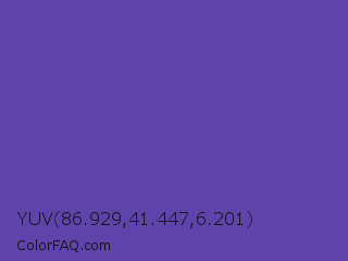 YUV 86.929,41.447,6.201 Color is a normal indigo color and the nearest color is Plump Purple #5946b2. Hex code #5e43ab and RGB value is rgb(94,67,171). In RGB color space, this color is composed of 37% red, 26% green, 67% blue, In CMYK color space, this color is composed of 45% cyan, 61% magenta, 0% yellow , 33% black , In HSL color space, this color has a hue angle of 256° , 44% saturation and 47% lightness.