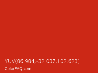 YUV 86.984,-32.037,102.623 Color is a normal red color and the nearest color is Thunderbird #c02b18. Hex code #cc2816 and RGB value is rgb(204,40,22). In RGB color space, this color is composed of 80% red, 16% green, 9% blue, In CMYK color space, this color is composed of 0% cyan, 80% magenta, 89% yellow , 20% black , In HSL color space, this color has a hue angle of 6° , 81% saturation and 44% lightness.