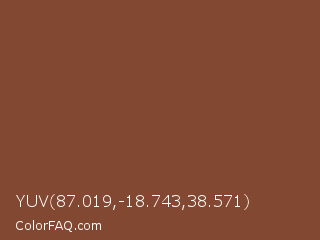 YUV 87.019,-18.743,38.571 Color is a normal orange color and the nearest color is Nutmeg #81422c. Hex code #834831 and RGB value is rgb(131,72,49). In RGB color space, this color is composed of 51% red, 28% green, 19% blue, In CMYK color space, this color is composed of 0% cyan, 45% magenta, 63% yellow , 49% black , In HSL color space, this color has a hue angle of 17° , 46% saturation and 35% lightness.