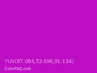 YUV 87.084,53.696,91.134 Color is a normal magenta color and the nearest color is Deep Magenta #cc00cc. Hex code #bf0dc4 and RGB value is rgb(191,13,196). In RGB color space, this color is composed of 75% red, 5% green, 77% blue, In CMYK color space, this color is composed of 3% cyan, 93% magenta, 0% yellow , 23% black , In HSL color space, this color has a hue angle of 298° , 88% saturation and 41% lightness.