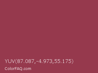 YUV 87.087,-4.973,55.175 Color is a normal red color and the nearest color is Smoky Topaz #933d41. Hex code #96394d and RGB value is rgb(150,57,77). In RGB color space, this color is composed of 59% red, 22% green, 30% blue, In CMYK color space, this color is composed of 0% cyan, 62% magenta, 49% yellow , 41% black , In HSL color space, this color has a hue angle of 347° , 45% saturation and 41% lightness.