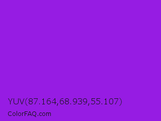 YUV 87.164,68.939,55.107 Color is a normal purple color and the nearest color is Veronica #a020f0. Hex code #961ce3 and RGB value is rgb(150,28,227). In RGB color space, this color is composed of 59% red, 11% green, 89% blue, In CMYK color space, this color is composed of 34% cyan, 88% magenta, 0% yellow , 11% black , In HSL color space, this color has a hue angle of 277° , 78% saturation and 50% lightness.