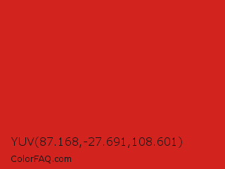 YUV 87.168,-27.691,108.601 Color is a normal red color and the nearest color is Maximum Red #d92121. Hex code #d3231f and RGB value is rgb(211,35,31). In RGB color space, this color is composed of 83% red, 14% green, 12% blue, In CMYK color space, this color is composed of 0% cyan, 83% magenta, 85% yellow , 17% black , In HSL color space, this color has a hue angle of 1° , 74% saturation and 47% lightness.