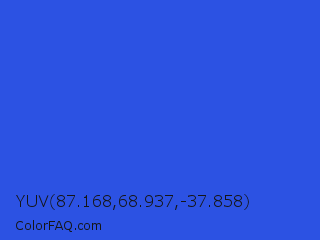 YUV 87.168,68.937,-37.858 Color is a normal blue color and the nearest color is Palatinate Blue #273be2. Hex code #2c52e3 and RGB value is rgb(44,82,227). In RGB color space, this color is composed of 17% red, 32% green, 89% blue, In CMYK color space, this color is composed of 81% cyan, 64% magenta, 0% yellow , 11% black , In HSL color space, this color has a hue angle of 228° , 77% saturation and 53% lightness.