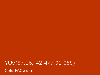 YUV 87.16,-42.477,91.068 Color is a normal orange color and the nearest color is Mahogany #c04000. Hex code #bf3301 and RGB value is rgb(191,51,1). In RGB color space, this color is composed of 75% red, 20% green, 0% blue, In CMYK color space, this color is composed of 0% cyan, 73% magenta, 99% yellow , 25% black , In HSL color space, this color has a hue angle of 16° , 99% saturation and 38% lightness.