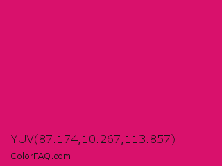 YUV 87.174,10.267,113.857 Color is a normal rose color and the nearest color is Dogwood Rose #d71868. Hex code #d9116c and RGB value is rgb(217,17,108). In RGB color space, this color is composed of 85% red, 7% green, 42% blue, In CMYK color space, this color is composed of 0% cyan, 92% magenta, 50% yellow , 15% black , In HSL color space, this color has a hue angle of 333° , 85% saturation and 46% lightness.