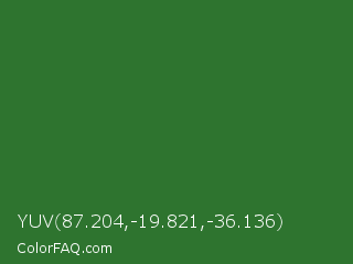 YUV 87.204,-19.821,-36.136 Color is a normal green color and the nearest color is Mughal Green #306030. Hex code #2e742f and RGB value is rgb(46,116,47). In RGB color space, this color is composed of 18% red, 45% green, 18% blue, In CMYK color space, this color is composed of 60% cyan, 0% magenta, 59% yellow , 55% black , In HSL color space, this color has a hue angle of 121° , 43% saturation and 32% lightness.