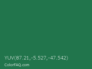YUV 87.21,-5.527,-47.542 Color is a dark green color and the nearest color is Dark Spring Green #177245. Hex code #21754c and RGB value is rgb(33,117,76). In RGB color space, this color is composed of 13% red, 46% green, 30% blue, In CMYK color space, this color is composed of 72% cyan, 0% magenta, 35% yellow , 54% black , In HSL color space, this color has a hue angle of 151° , 56% saturation and 29% lightness.