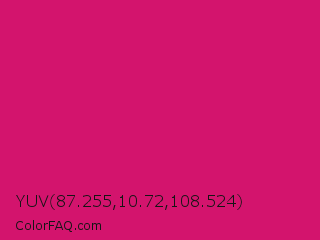 YUV 87.255,10.72,108.524 Color is a normal rose color and the nearest color is Dogwood Rose #d71868. Hex code #d3146d and RGB value is rgb(211,20,109). In RGB color space, this color is composed of 83% red, 8% green, 43% blue, In CMYK color space, this color is composed of 0% cyan, 91% magenta, 48% yellow , 17% black , In HSL color space, this color has a hue angle of 332° , 83% saturation and 45% lightness.
