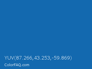 YUV 87.266,43.253,-59.869 Color is a normal blue color and the nearest color is Green Blue #1164b4. Hex code #1369af and RGB value is rgb(19,105,175). In RGB color space, this color is composed of 7% red, 41% green, 69% blue, In CMYK color space, this color is composed of 89% cyan, 40% magenta, 0% yellow , 31% black , In HSL color space, this color has a hue angle of 207° , 80% saturation and 38% lightness.