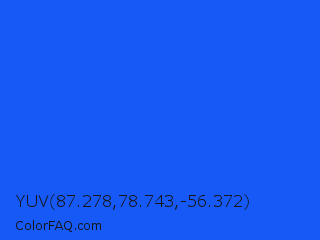 YUV 87.278,78.743,-56.372 Color is a normal blue color and the nearest color is Blue Ribbon #0066ff. Hex code #1759f7 and RGB value is rgb(23,89,247). In RGB color space, this color is composed of 9% red, 35% green, 97% blue, In CMYK color space, this color is composed of 91% cyan, 64% magenta, 0% yellow , 3% black , In HSL color space, this color has a hue angle of 222° , 93% saturation and 53% lightness.