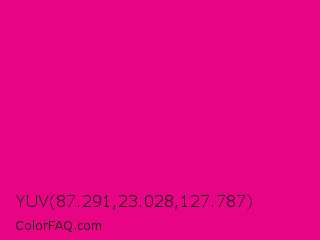 YUV 87.291,23.028,127.787 Color is a normal magenta color and the nearest color is Mexican Pink #e4007c. Hex code #e90486 and RGB value is rgb(233,4,134). In RGB color space, this color is composed of 91% red, 2% green, 53% blue, In CMYK color space, this color is composed of 0% cyan, 98% magenta, 42% yellow , 9% black , In HSL color space, this color has a hue angle of 326° , 97% saturation and 46% lightness.