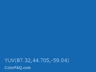 YUV 87.32,44.705,-59.04 Color is a normal blue color and the nearest color is Green Blue #1164b4. Hex code #1468b2 and RGB value is rgb(20,104,178). In RGB color space, this color is composed of 8% red, 41% green, 70% blue, In CMYK color space, this color is composed of 89% cyan, 42% magenta, 0% yellow , 30% black , In HSL color space, this color has a hue angle of 208° , 80% saturation and 39% lightness.