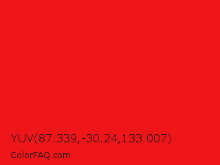 YUV 87.339,-30.24,133.007 Color is a normal red color and the nearest color is Red Pigment #ed1c24. Hex code #ef161a and RGB value is rgb(239,22,26). In RGB color space, this color is composed of 94% red, 9% green, 10% blue, In CMYK color space, this color is composed of 0% cyan, 91% magenta, 89% yellow , 6% black , In HSL color space, this color has a hue angle of 359° , 87% saturation and 51% lightness.